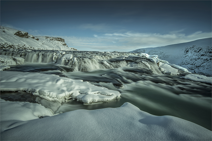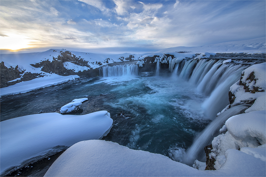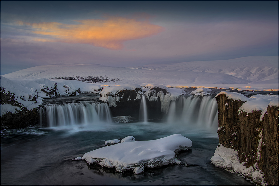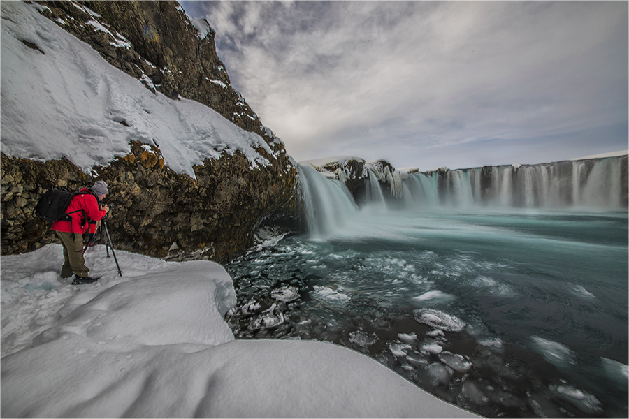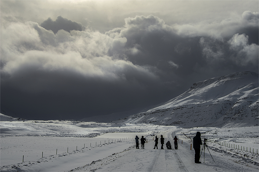 Iceland greeted us with sunshine the first day. Not bad for winter. In fact Ewen Bell and Myself had done a considerable amount of research for both the Arctic circle in Norway and our second workshop straight after in Iceland…as to the best time photographically, and this coupled with the best weather. This time of year is the absolute ideal combination of stable weather conditions and magnificent stunning photography. Snow scenes abound and the light show from the heavens…especially at night when the Northern lights are at their best, proved that we had done our research properly. It pays to listen to other professional photographers and not just read guidebooks! Our first three days here are incredible… Northern lights at night, wonderful back-lighting during the day…almost on cue, when we want it…and ever-changing skies. We got a beautiful dusting of snow last night and crunching through this to capture images is just totally amazing.